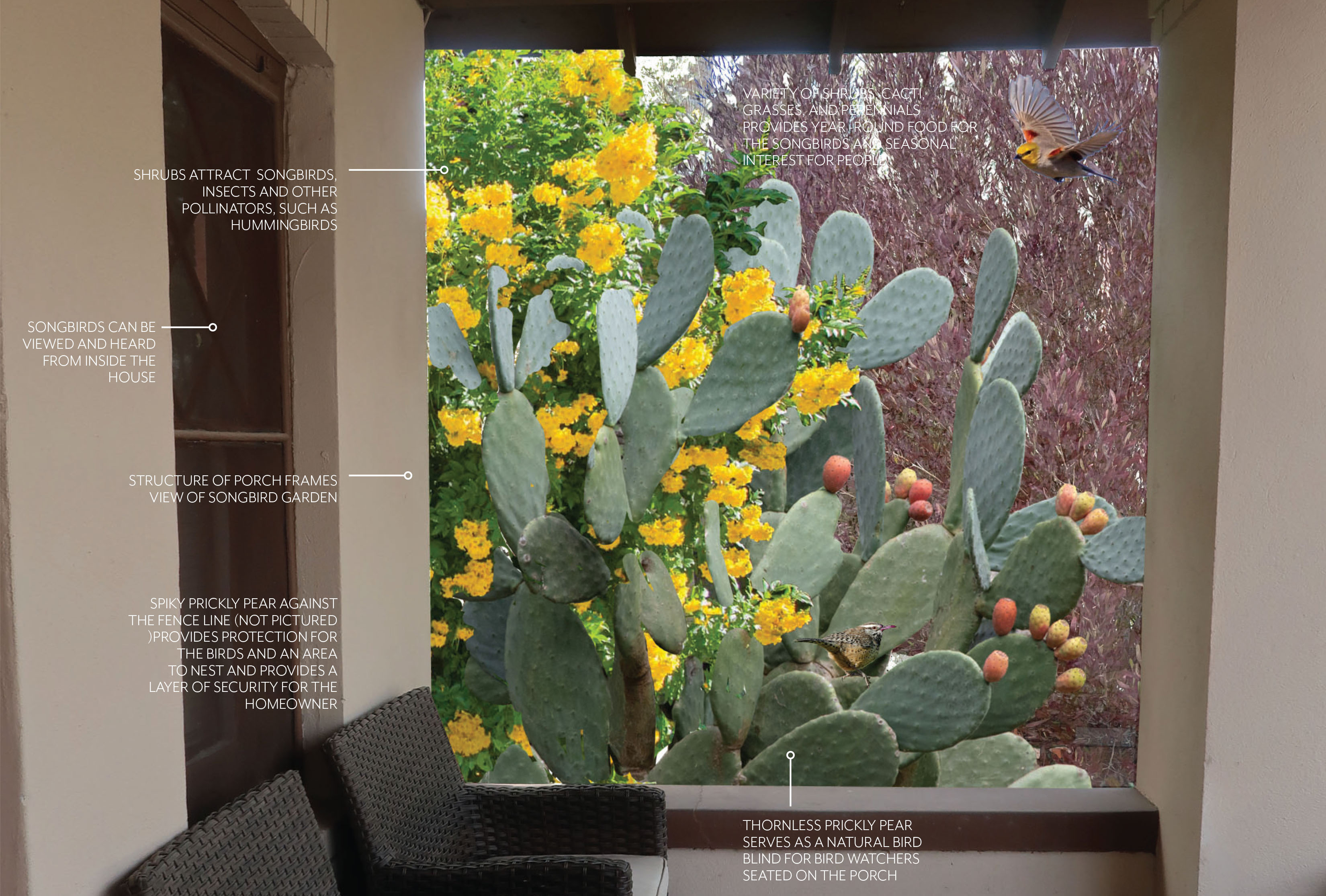 Adding a protective touch, spiky cacti along the fenceline serve as a barrier, providing a secure space for birds to nest and thrive.